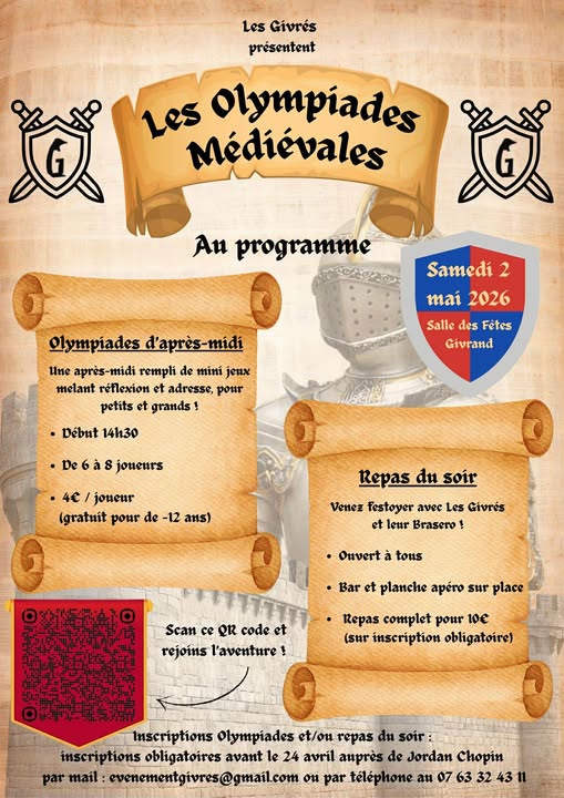 Les Olympiades médiévales se tiendront le 2 mai 2026 à la salle Les Quatre Vents à Givrand, pour une journée festive placée sous le signe du Moyen Âge.