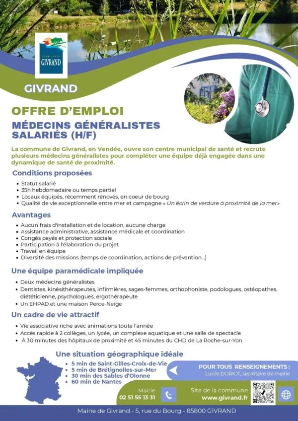 Le centre communal de santé prend forme : des travaux sont en cours pour permettre l’accueil de médecins salariés, répondant à une attente forte des Givrandais. L’ouverture est envisagée pour l’automne.